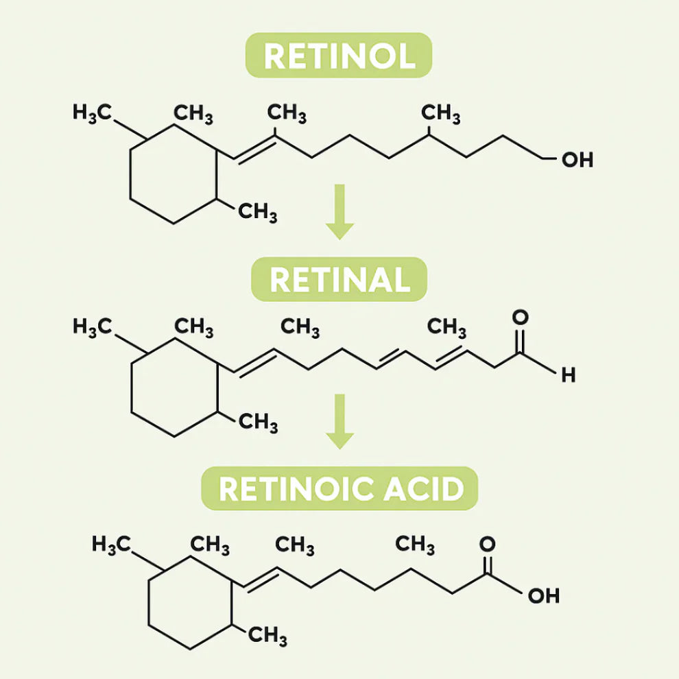 A diferencia del retinol tradicional, el retinal nada más necesita una conversión dentro de la piel para transformarse en ácido retinoico, la forma activa responsable de estimular la renovación celular.
